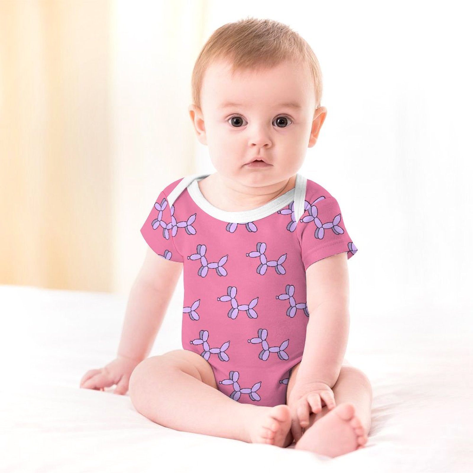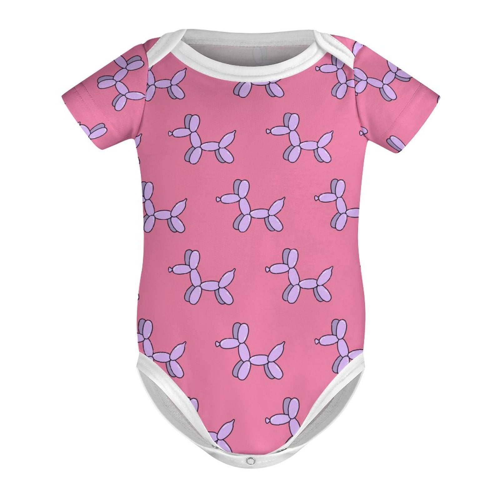 Who doesn't love getting a balloon animal? These cute lavender balloon dogs are patterned all over this pink onesie with white trim...unique and adorable! These baby onesies are made to order, so please allow up to a month for delivery. If you order additional items, they will be shipped separately.