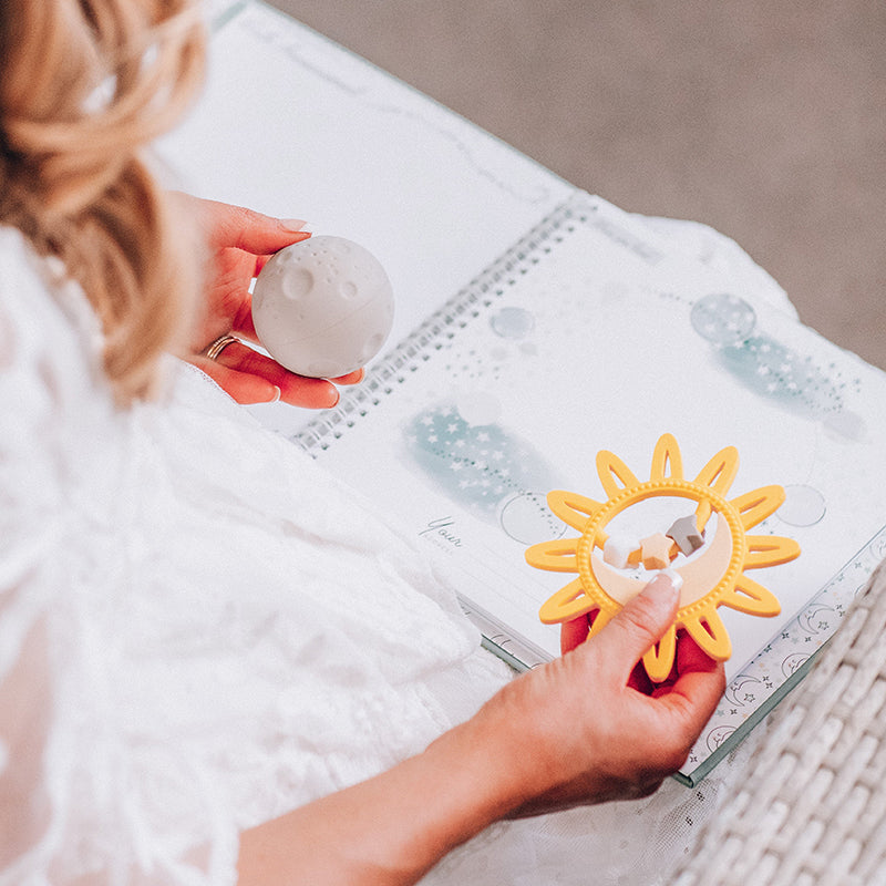 Indulge your baby in playful discovery and sensory exploration with Lucy Darling's Celestial Skies Teether Toy Set—a must-have addition to your little one's collection of comforting companions. Plus, it pairs well with our Celestial Skies Luxury Memory Book!