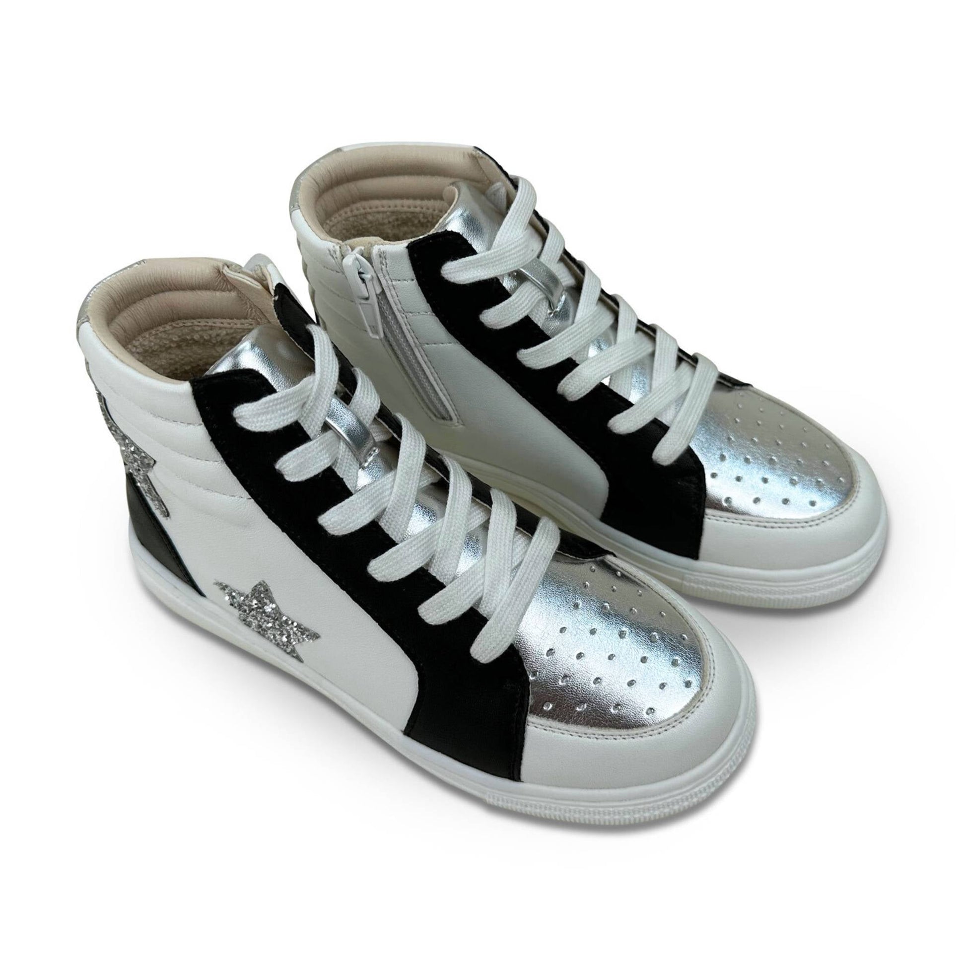 Make every step a fashion statement with the Miss Hannah High-Top Sneakers! These dazzling sneakers combine contrasting colors, shimmering glitter, and metallic accents to create a standout look that your little one will love.