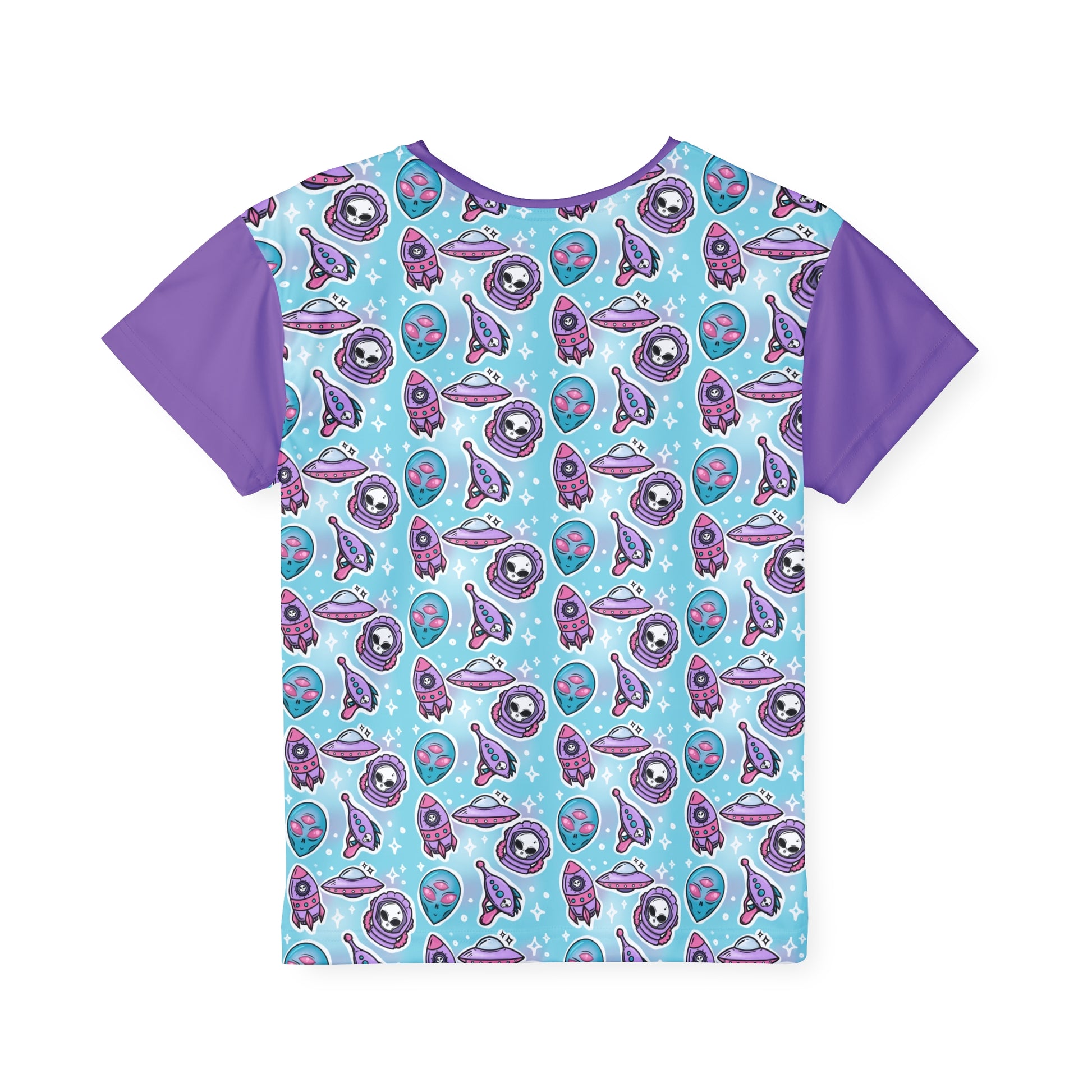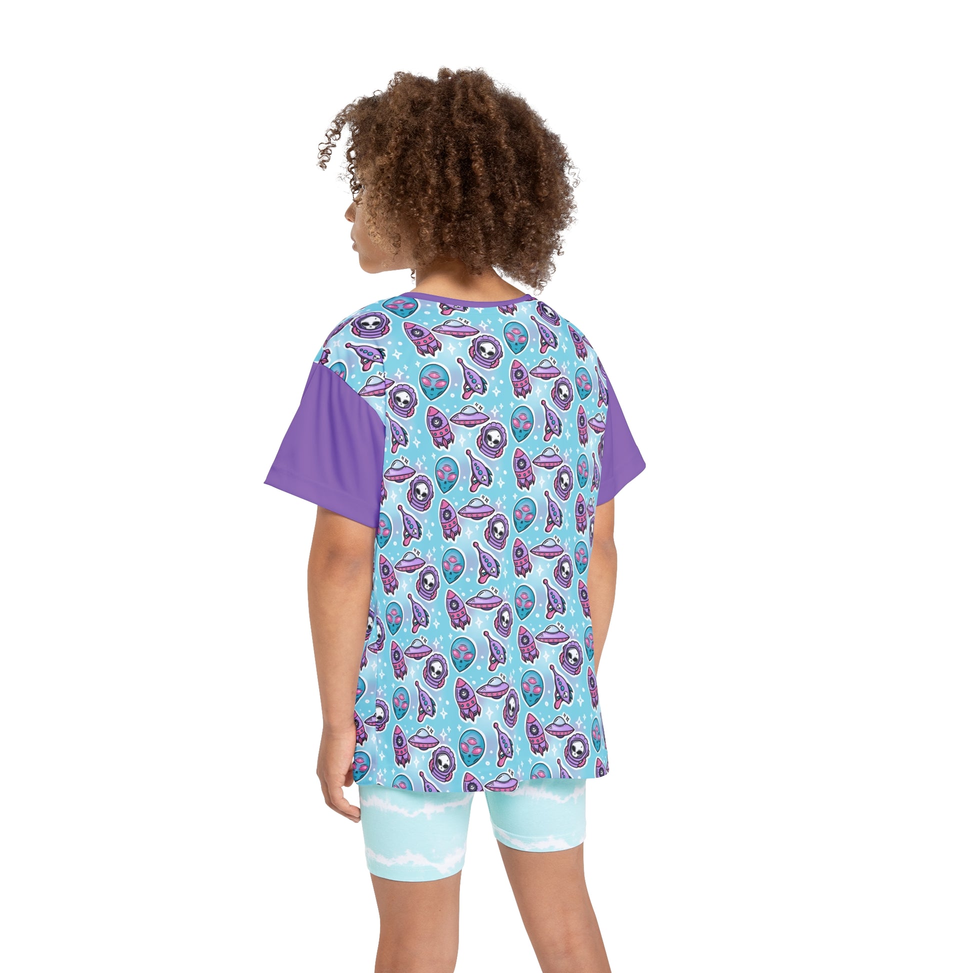 We love an alien theme and this Remy + Zara brand top is just TOO CUTE! Featuring an all over pastel alien/UFO/space print with lavender sleeves and collar, this unique and cool piece will have your little astronaut vibing in style. Made with 100% moisture-wicking polyester, these tees are stretchy, durable, and deliver total comfort for any activity.